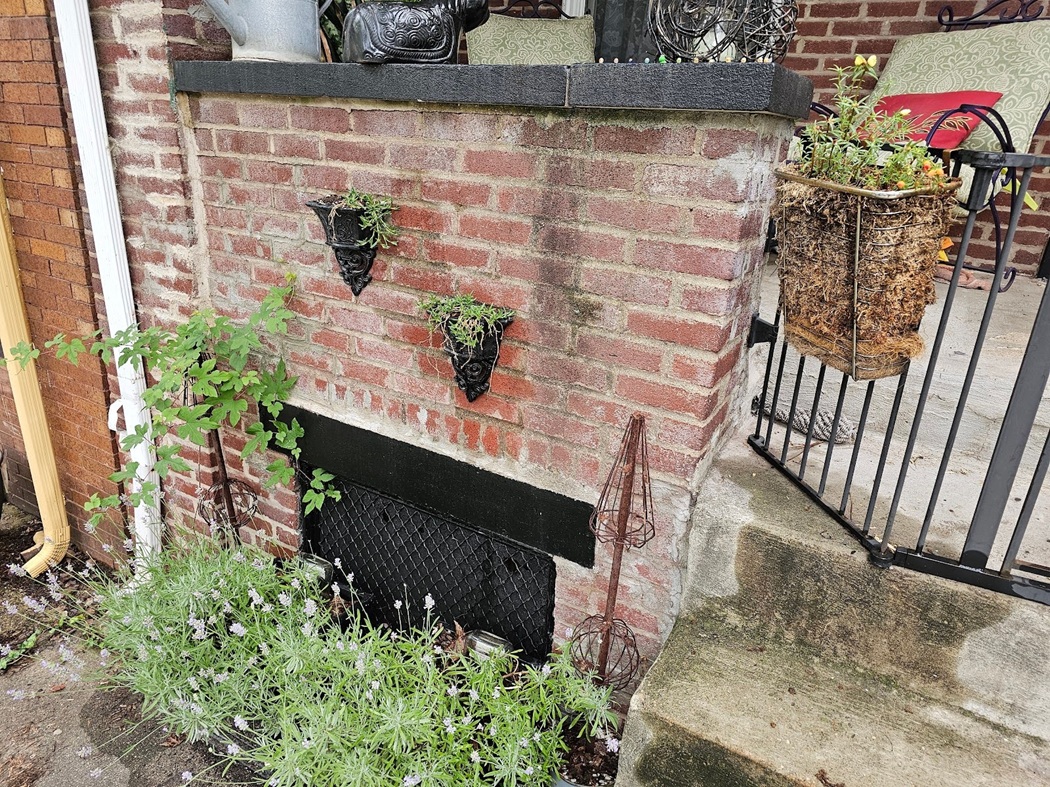 The black accent colors on the porch reflect the color of the decorative planters and the wall mounted planters. Even though these elements are painted and we can’t see the texture, it’s most likely these black architectural elements are made from concrete. In many cases, concrete lintels are used in masonry openings. This particular building is over 100 years old though. Back that far in history, concrete lintels were not used in most types of DC urban masonry architecture.