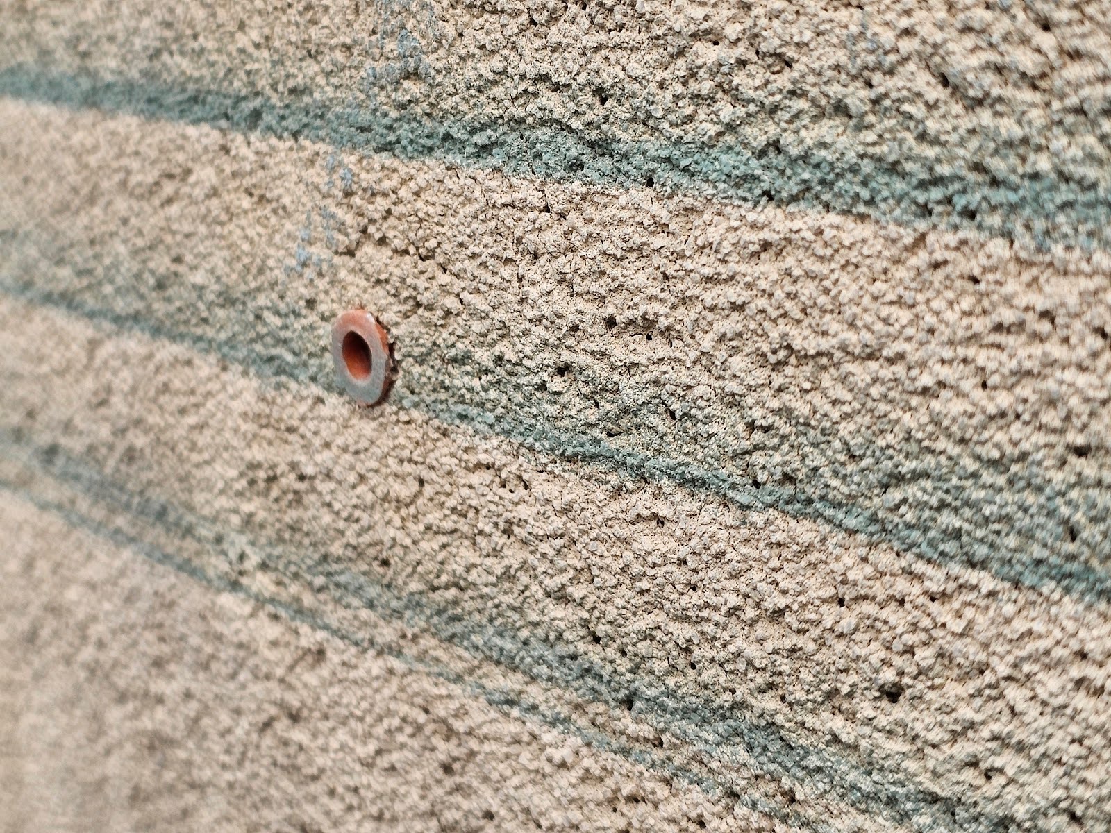 The next picture below shows the closest view. Almost all although the lines of paint are faint, they look particularly real because they also have a bit of a gradient. The gradient, in this case refers to a slight amount of diffusion where they go from a more concentrated line to a line that slightly disappears away from the core center. It also helps that none of the lines are excessively crisp. Too much emphasis might look exaggerated. You can see a plastic screw mounting sleeve has been installed through these stucco surface. Not all fasteners can mount well into cementitious masonry substrates.